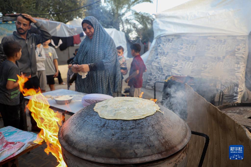 11月6日,因缺乏燃料,在加沙地帶南部城市汗尤尼斯的一處臨時難民營,人們用粘土砌成的爐子烤制面包。