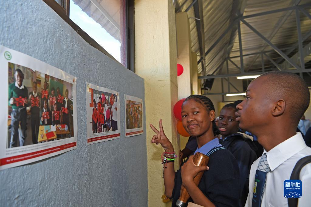 11月6日,學生在納米比亞溫得和克舉行的納米比亞大學孔子學院建院十周年慶典上觀看圖片展。