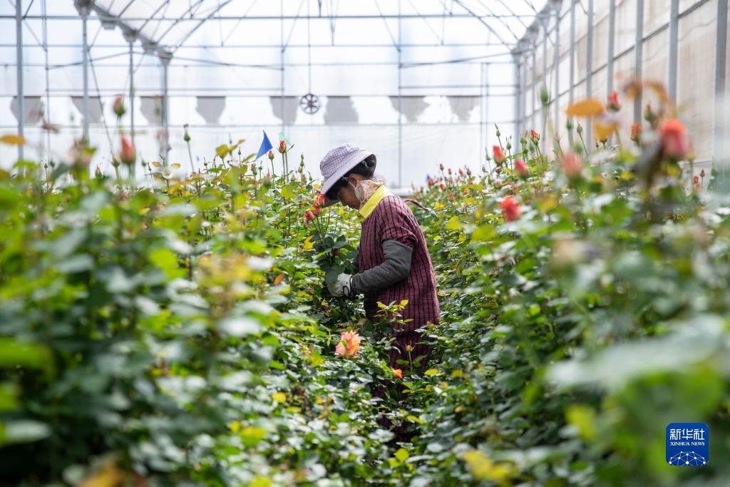 工人在姚安云秀花卉有限公司智能溫室大棚采摘鮮花(11月6日攝)。