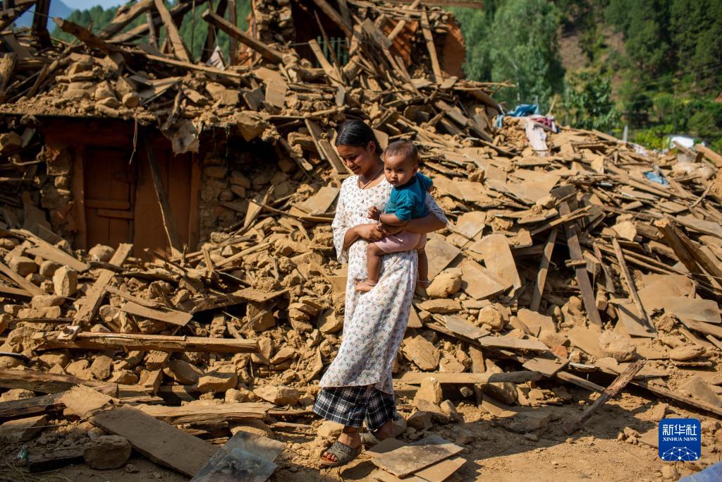 11月6日,在尼泊爾西部扎澤爾果德地震災(zāi)區(qū),一名女子抱著孩子從建筑物廢墟前走過。