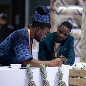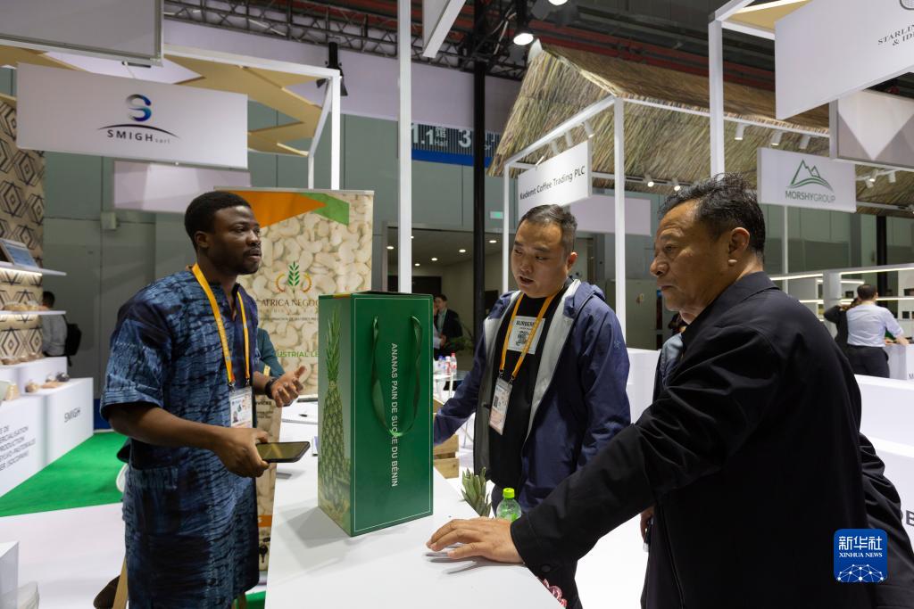 11月6日,在第六屆進博會食品及農產品展區,貝寧投資和出口促進局工作人員(左)在接待前來咨詢的客戶。