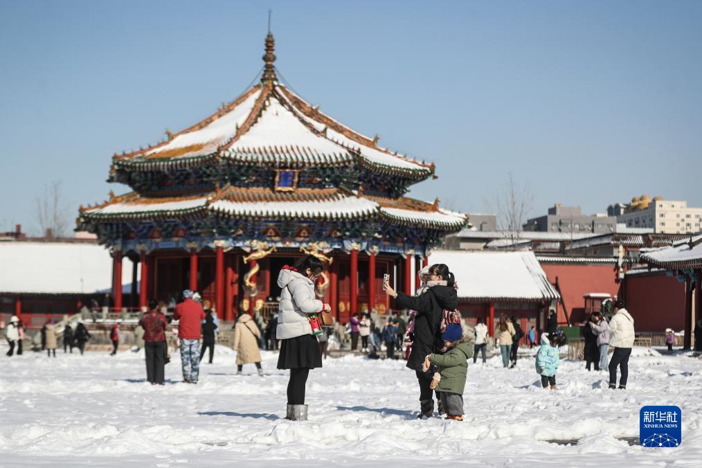 11月7日,游客在雪后的沈陽故宮游覽拍照。