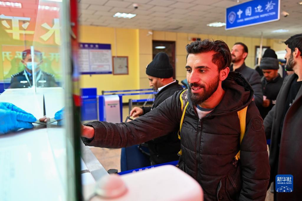 在新疆紅其拉甫口岸聯檢大廳,紅其拉甫邊檢站民警為出境旅客辦理邊檢手續(11月6日攝)。