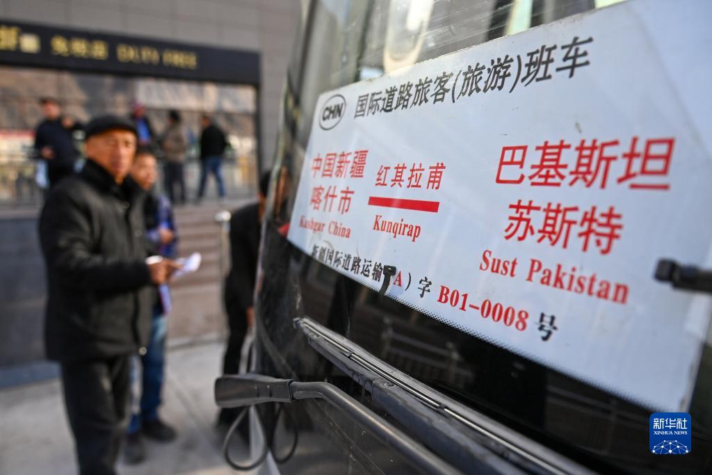 在新疆紅其拉甫口岸,出境旅客排隊登上國際道路旅客班車(11月6日攝)。
