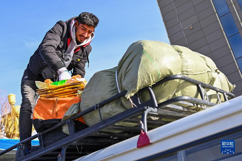 在新疆紅其拉甫口岸,出境旅客將行李固定在車上(11月6日攝)。