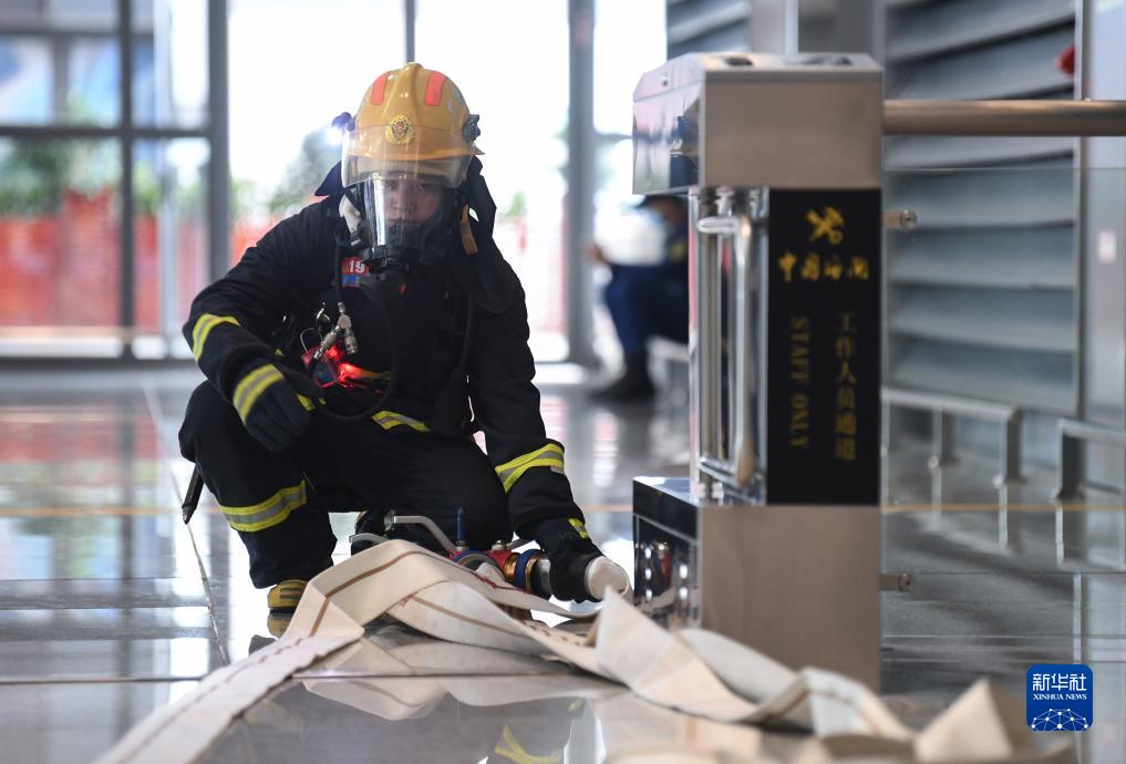 11月7日,在港珠澳大橋珠海公路口岸旅檢大樓,廣東消防員在演練中布設水帶。