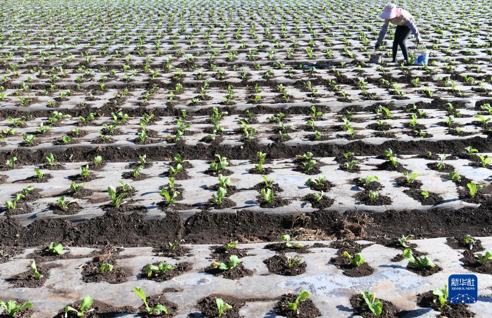 11月7日,在云南省麗江市玉龍縣黃山街道長水社區(qū),農(nóng)民給菜苗澆水。