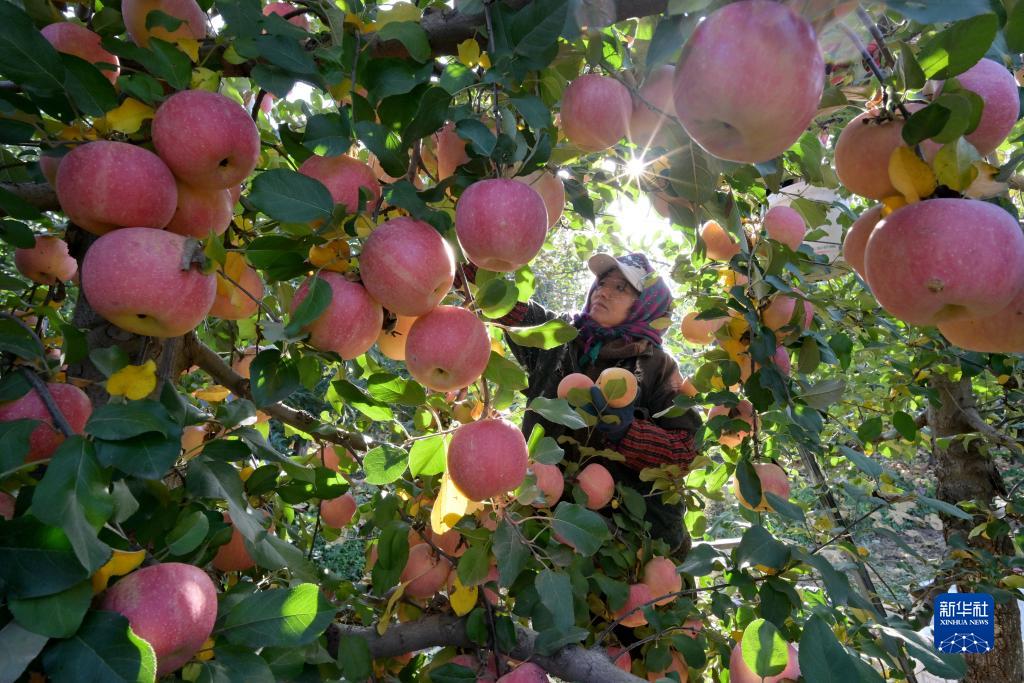 11月7日,在河北省灤州市王店子鎮臥龍谷生態農業科技園區,果農在采摘蘋果。