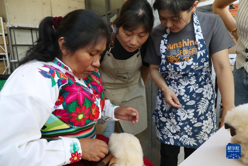 馬馬尼大叔的妻子格洛麗亞在“溫暖駝”品牌位于上海的倉庫內向本地員工演示羊駝玩偶修補的針法(11月2日攝)。