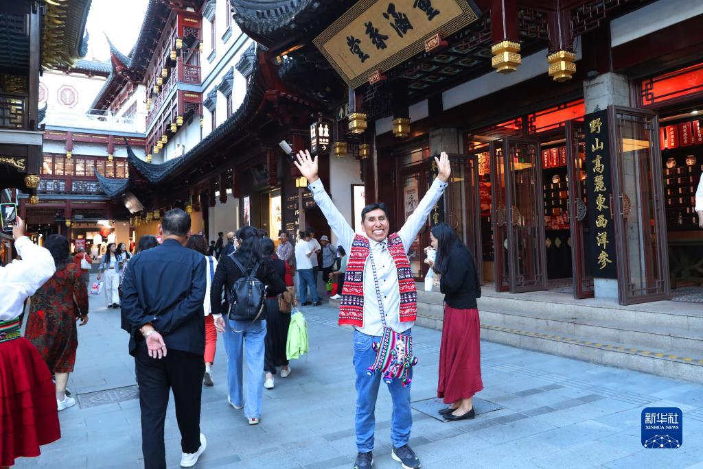馬馬尼大叔在上海豫園游玩時興奮地揮舞手臂(11月2日攝)。