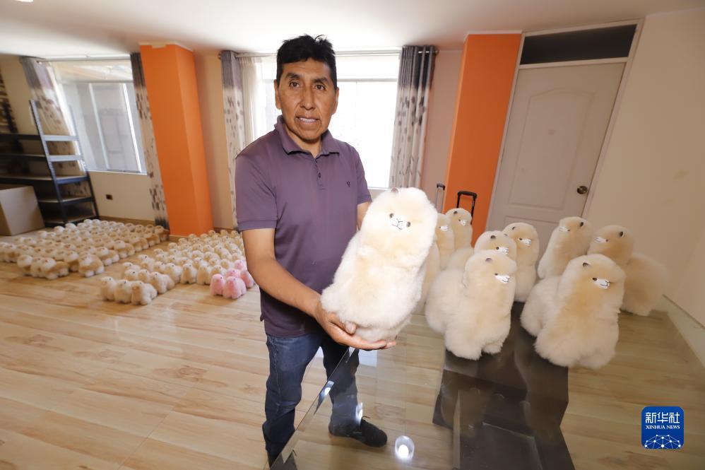 在秘魯南部城市阿雷基帕,馬馬尼大叔準備將在上海進博會上展示的羊駝玩偶(10月27日攝)。