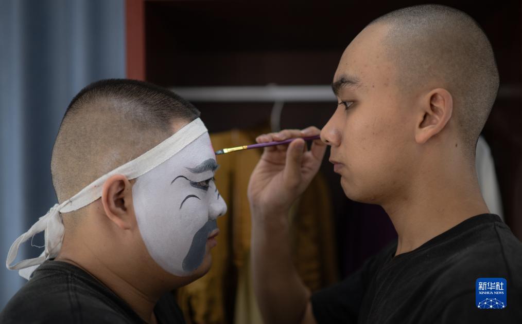 10月28日,漢劇演員王炳盛(右)為準備登臺的侯睿駿化妝。