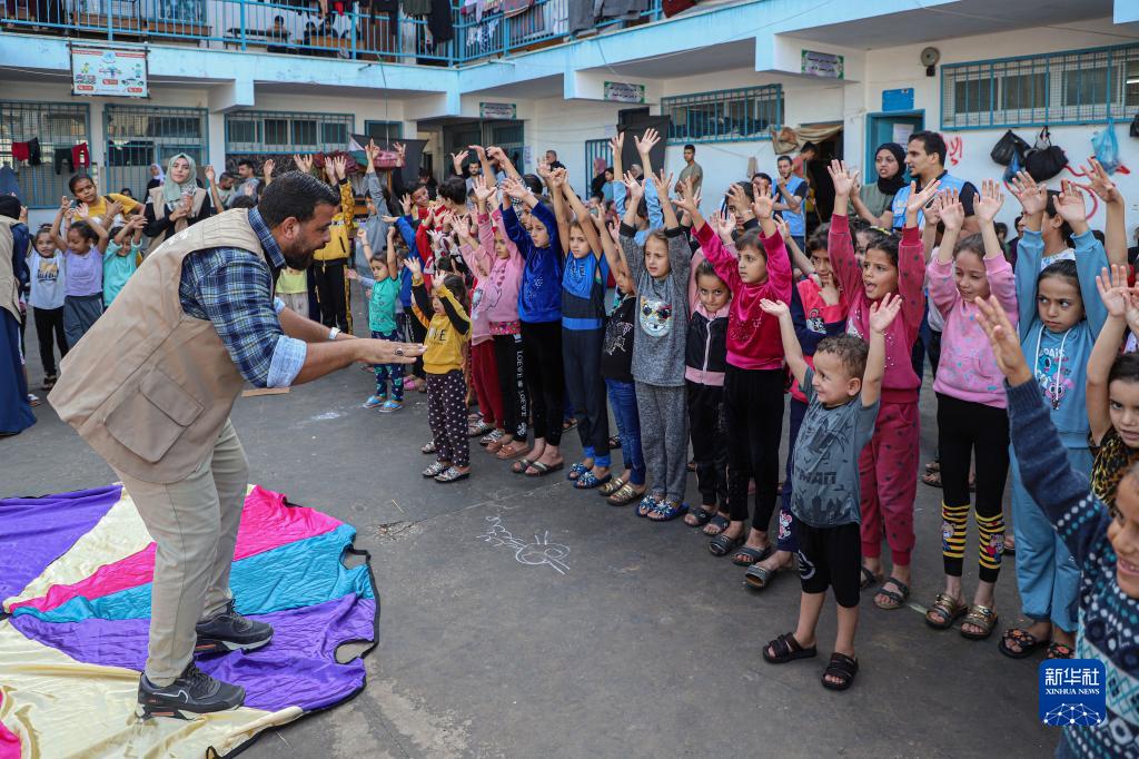 當日,在加沙地帶南部城市汗尤尼斯的一所聯合國近東巴勒斯坦難民救濟和工程處附屬學校內,當地志愿者組織多種活動,關愛流離失所的兒童,撫慰戰事創傷。新一輪巴以沖突爆發一個月來,加沙地帶已有超過1萬人死亡,其中大約40%是兒童。