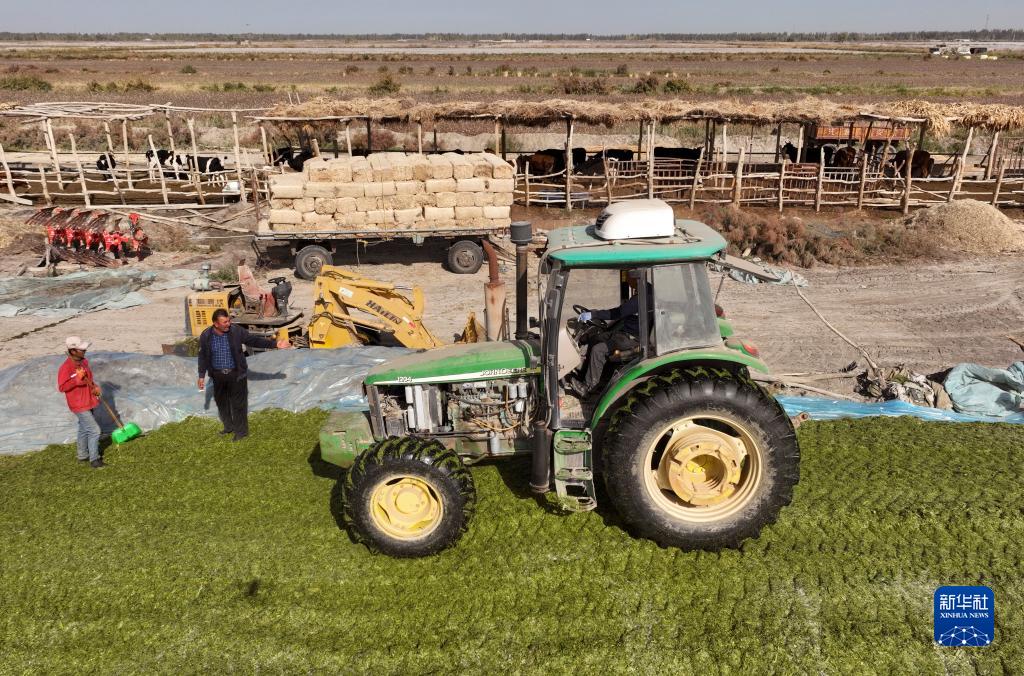 在新疆尉犁縣巴西買里村,爾肯(左二)查看青貯玉米儲存情況(10月24日攝,無人機照片)。