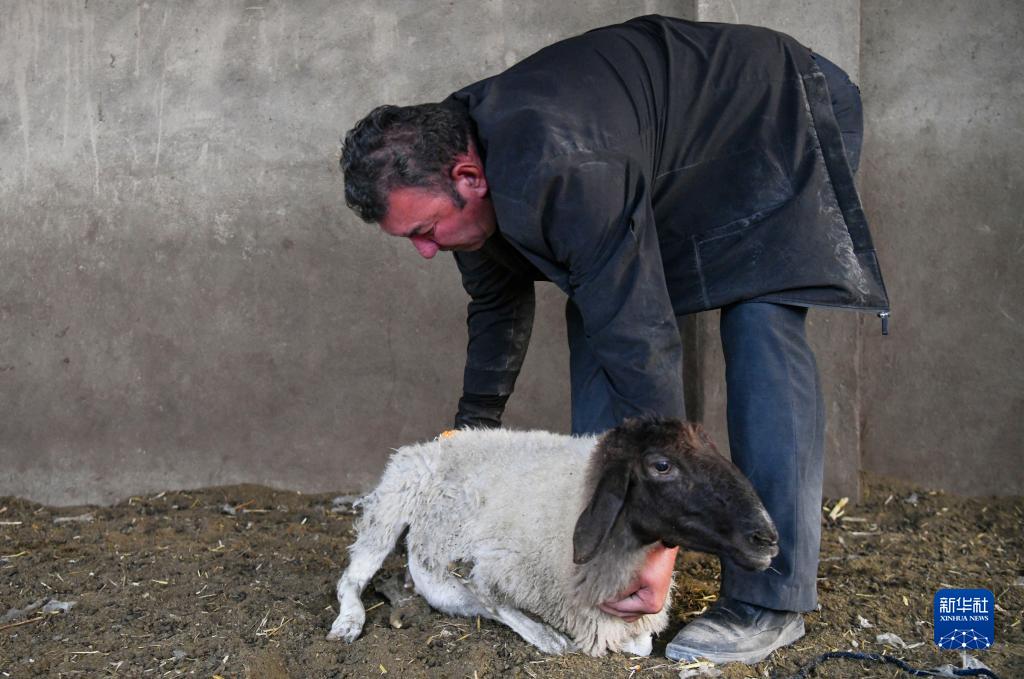 在新疆尉犁縣巴西買里村,爾肯檢查自家養(yǎng)的一只羊的身體狀況(10月19日攝)。