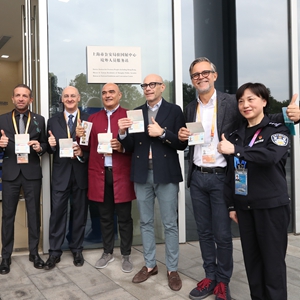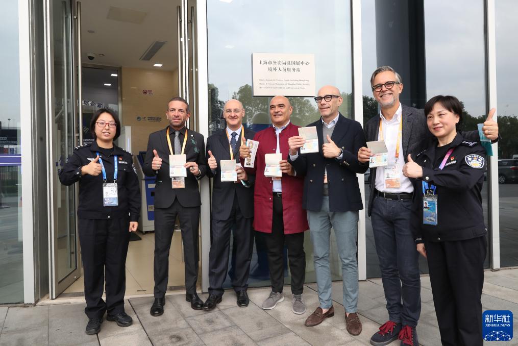 11月9日,首批完成簽證辦理的意大利參展商在上海市公安局駐國展中心境外人員服務(wù)站外與工作人員合影。