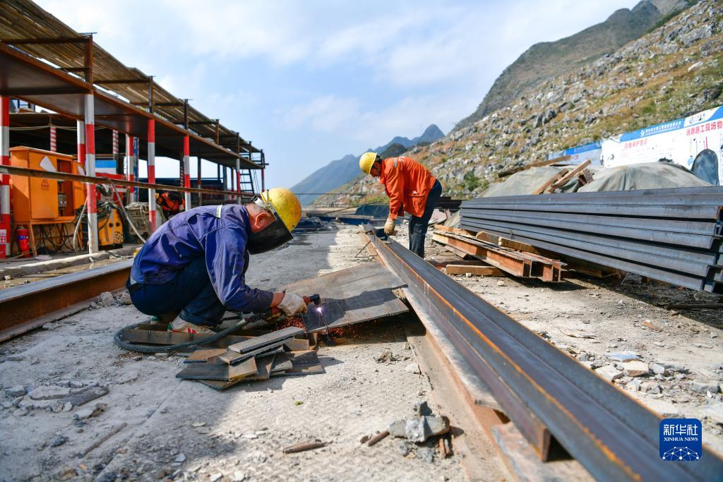 11月7日,工人在貴州六安高速花江峽谷大橋建設現場施工。
