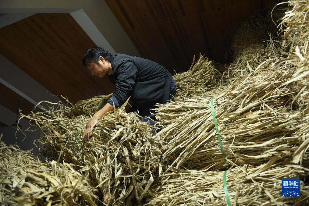 11月9日,在開化紙傳統技藝工坊,黃宏健搬運制作開化紙的原料——蕘花。