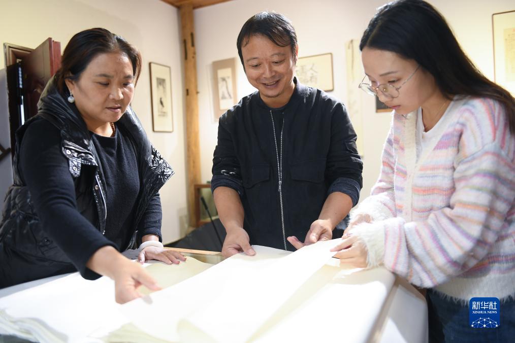 11月9日,在開化紙傳統(tǒng)技藝工坊,黃宏健(中)和妻子賴麗芳(左)向來訪者展示各類紙品。