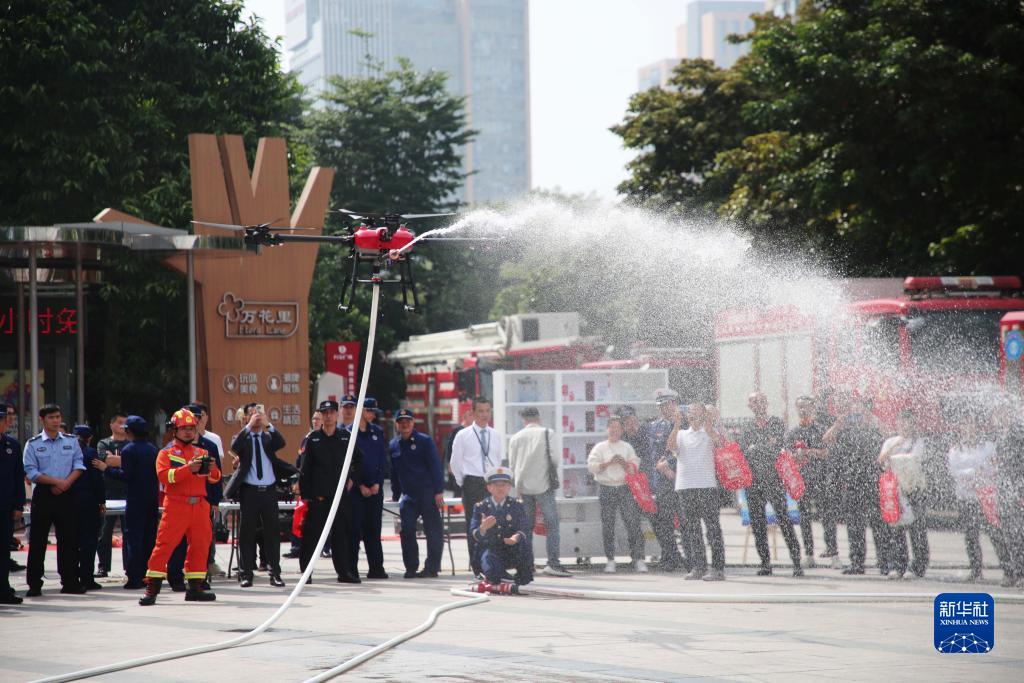11月9日,在福建省龍巖市萬寶廣場,消防員向市民演示無人機高空滅火。