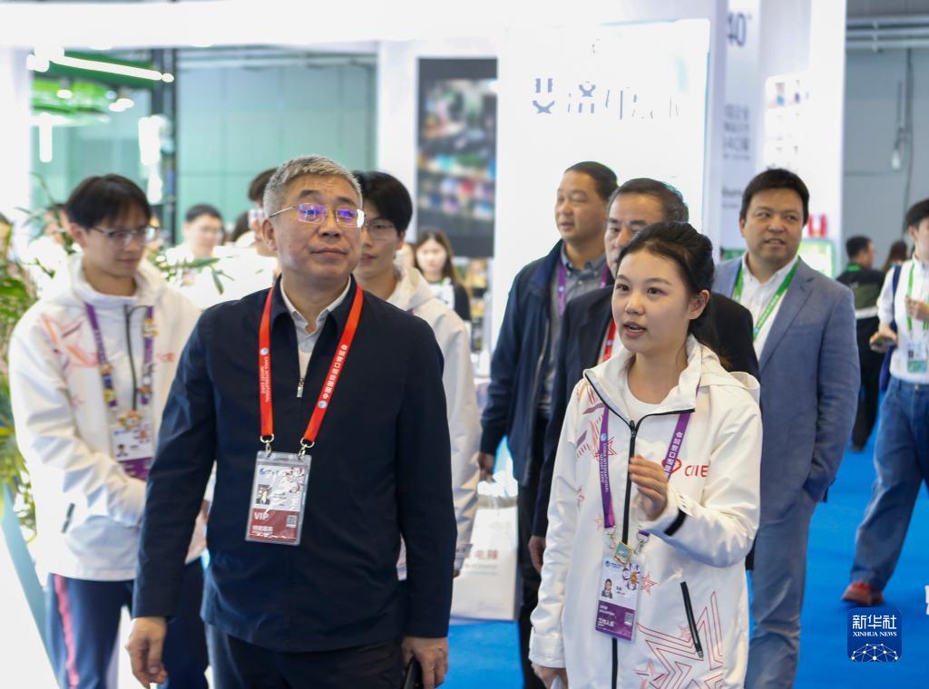 11月7日,在第六屆進博會上,上海理工大學志愿者吳楊(右)陪同嘉賓參觀。