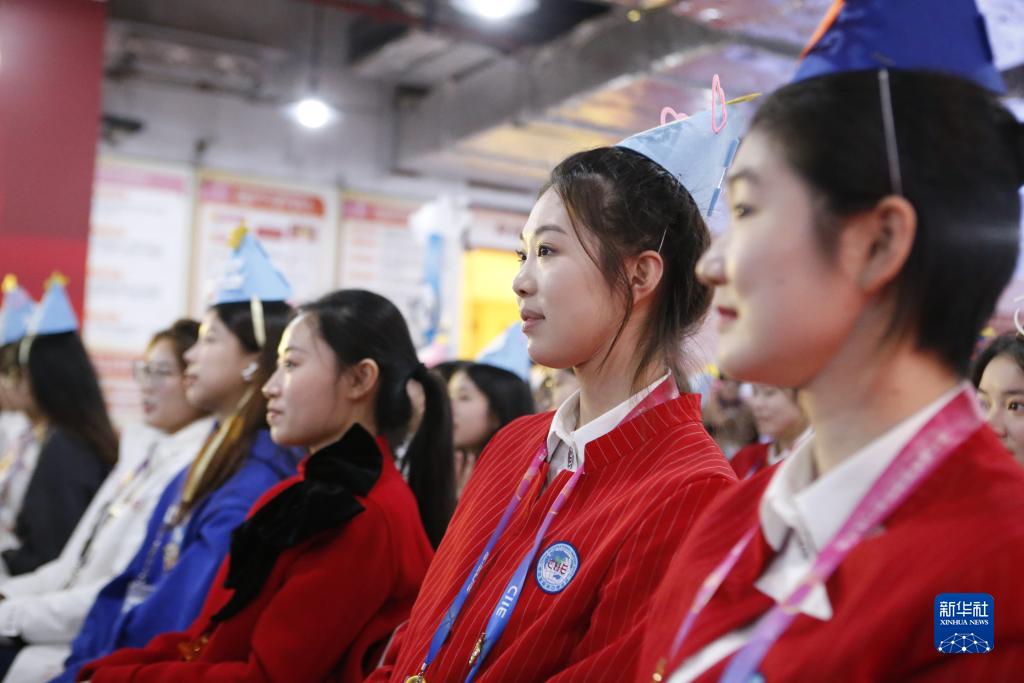 11月7日,在第六屆進博會上,東華大學志愿者崔未驊(右二)在參加集體生日會。當日,進博會志愿者之家為進博會期間過生日的“小葉子”舉辦集體生日會,送上生日驚喜。