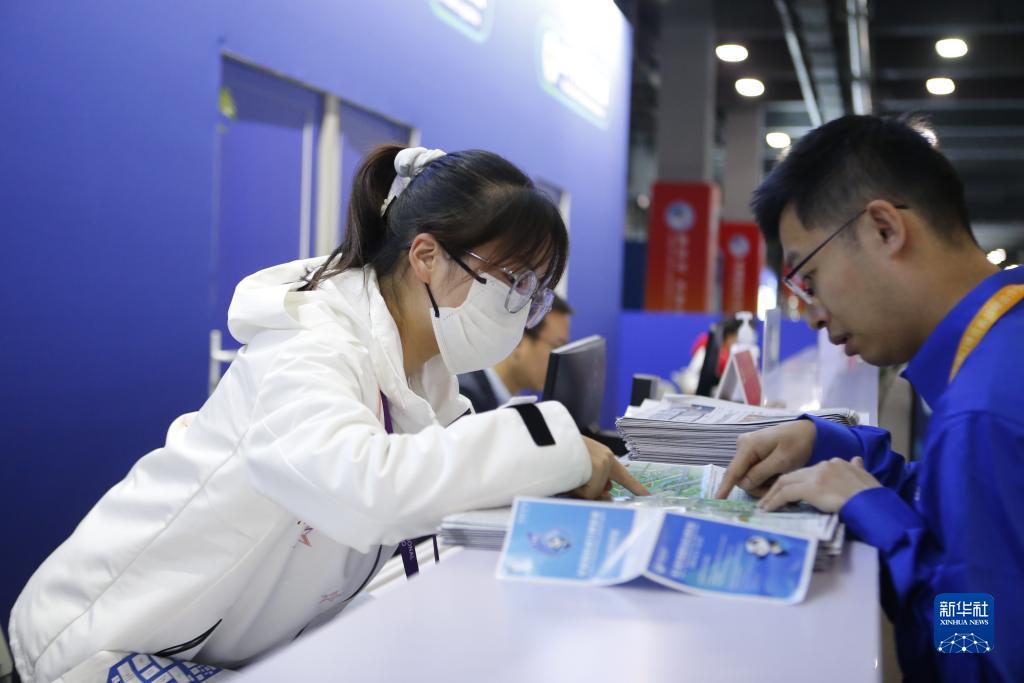 11月7日,在第六屆進博會引導臺,上海外國語大學志愿者章璇(左)為參觀者指路。