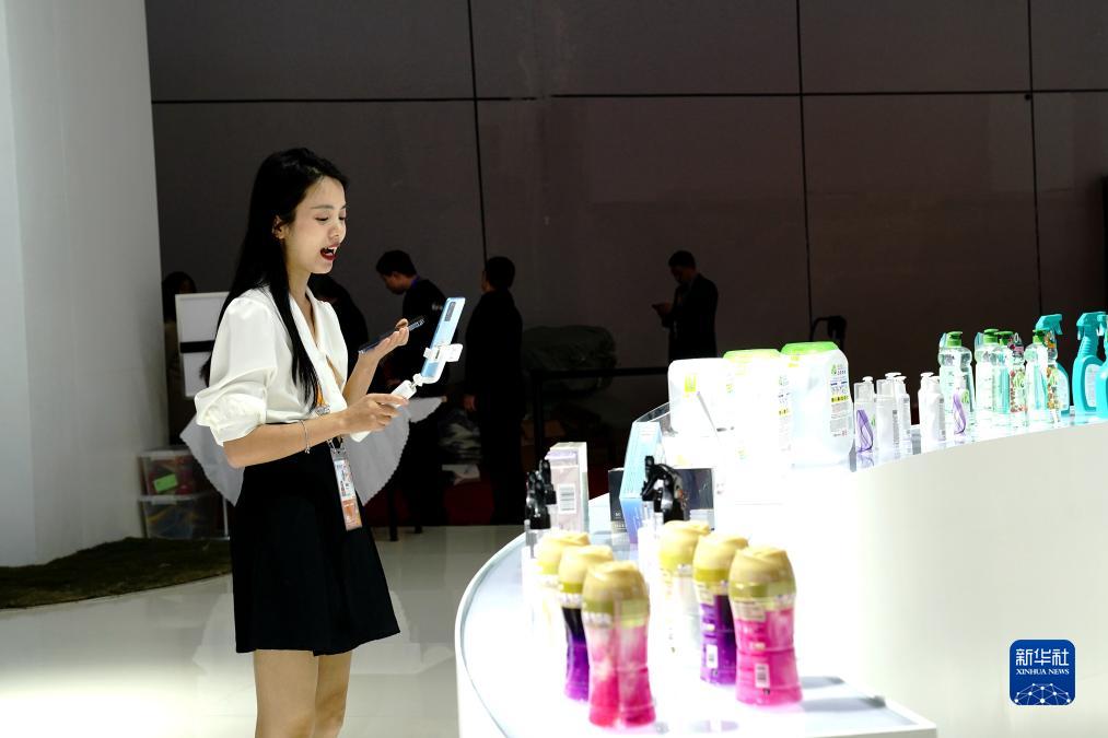 這是11月8日在第六屆進博會消費品展區拍攝的直播銷售場景。
