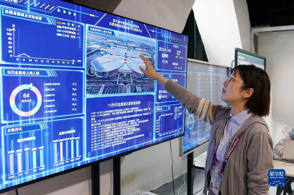 11月9日,工作人員在介紹第六屆進(jìn)博會(huì)志愿者服務(wù)保障組數(shù)字化管理平臺(tái)。該平臺(tái)依托智能手環(huán),通過動(dòng)態(tài)監(jiān)測(cè)和可視化顯示,對(duì)志愿者進(jìn)行數(shù)字化管理,為志愿者提供精心保障。