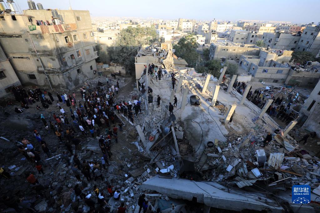 11月9日,在加沙地帶南部城市汗尤尼斯,人們?cè)谠庖陨幸u擊后的建筑廢墟中實(shí)施救援。