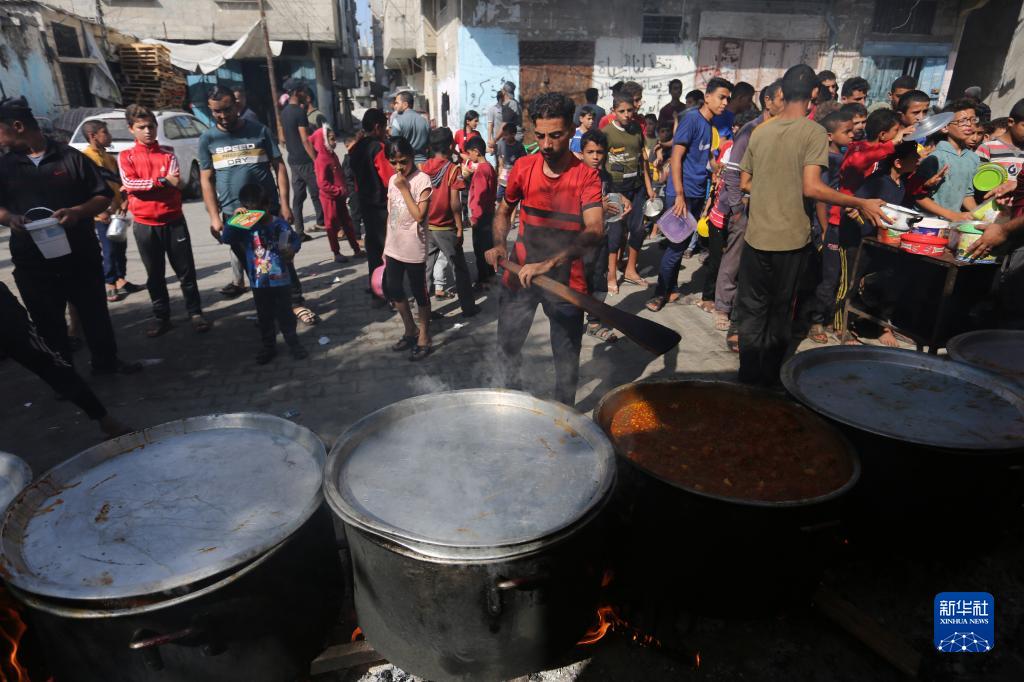 11月9日,在加沙地帶南部城市拉法,人們在一個臨時分發點排隊領取食物。