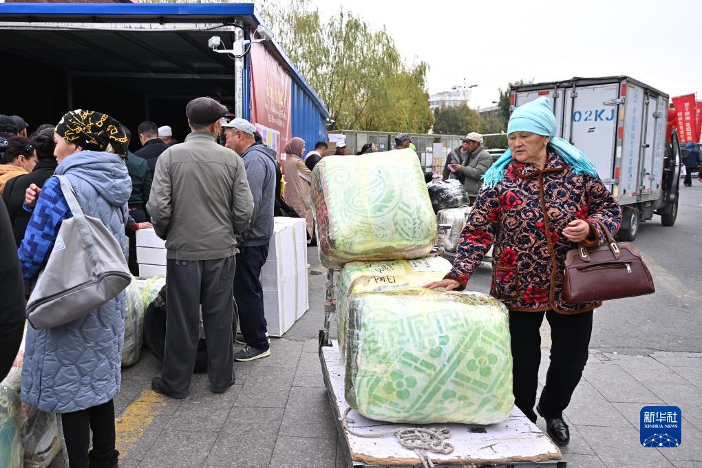 11月8日,在中哈霍爾果斯國際邊境合作中心,哈薩克斯坦的游客將購買的貨物打包發車。