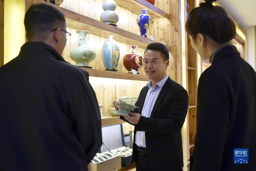 11月9日,李冰(中)在自己的工作室里向來訪者介紹金鑲玉作品。