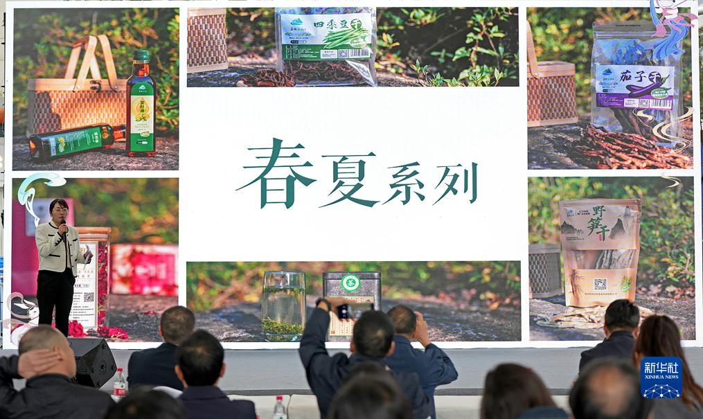 11月10日,在杭州市親橙里購物中心的“清涼峰味”共富品牌推介會上,清涼峰鎮的工作人員在推介山鄉優質的農產品。
