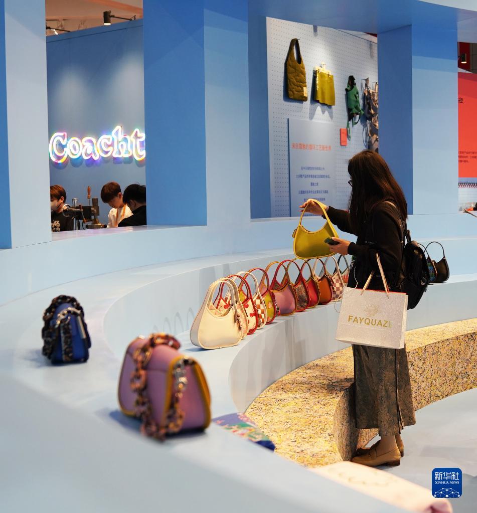 11月9日,在第六屆進(jìn)博會(huì)消費(fèi)品展區(qū)蔻馳展臺(tái),參觀者在挑選手提包。
