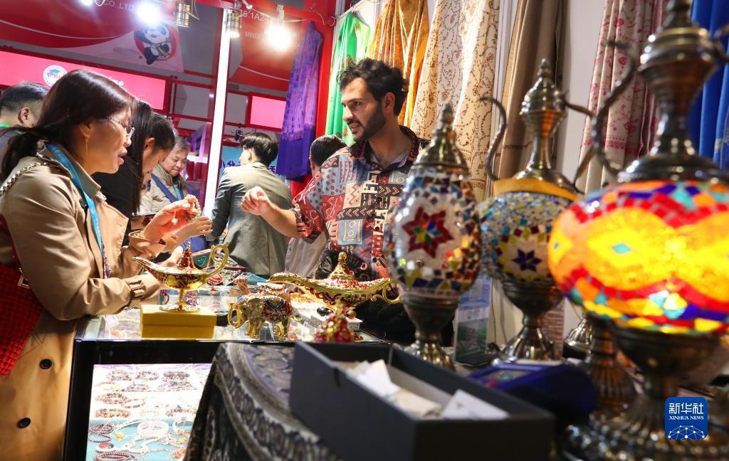 11月10日,在第六屆進(jìn)博會(huì)上,一名來自也門的展商(右)向觀眾介紹特色手工藝品。