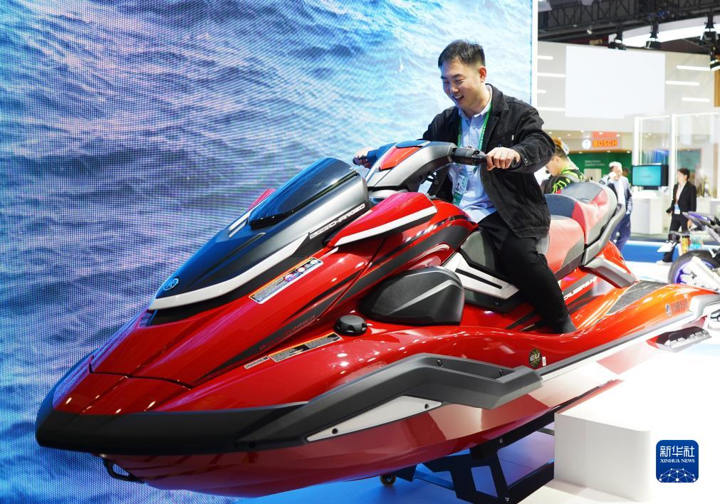 11月10日,在第六屆進博會汽車展區雅馬哈展臺,觀眾體驗一款摩托艇。