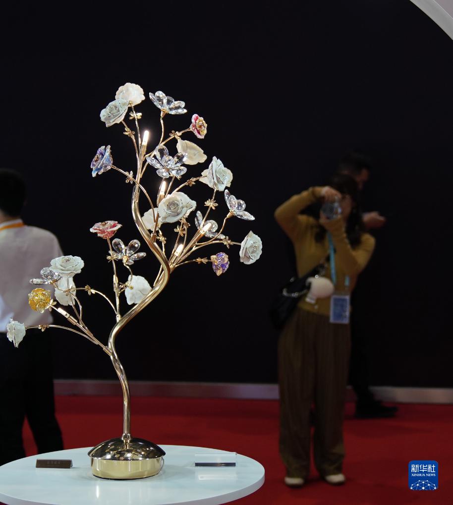 11月9日,在第六屆進博會消費品展區(qū),參觀者在EJI(雅寶珠寶國際有限公司)展臺拍攝展出的琺瑯鉆石花燈。
