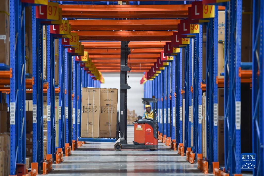 11月10日,在位于江蘇省南京市江寧區的蘇寧華東物流中心,工人駕駛叉車運輸商品。