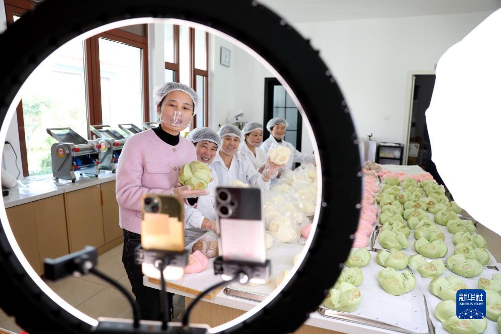 11月8日,山東省青島西海岸新區海青鎮共富電商直播基地,志愿者在直播售賣海青花饃。
