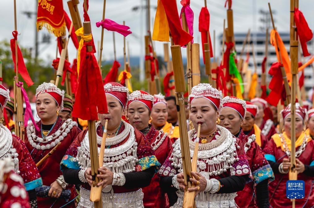 當(dāng)日,貴州省黔東南苗族侗族自治州黃平縣谷隴鎮(zhèn)迎來(lái)蘆笙節(jié)。當(dāng)?shù)孛缱迦罕娚碇⒀b,載歌載舞歡度節(jié)日,祈禱來(lái)年風(fēng)調(diào)雨順、五谷豐登。