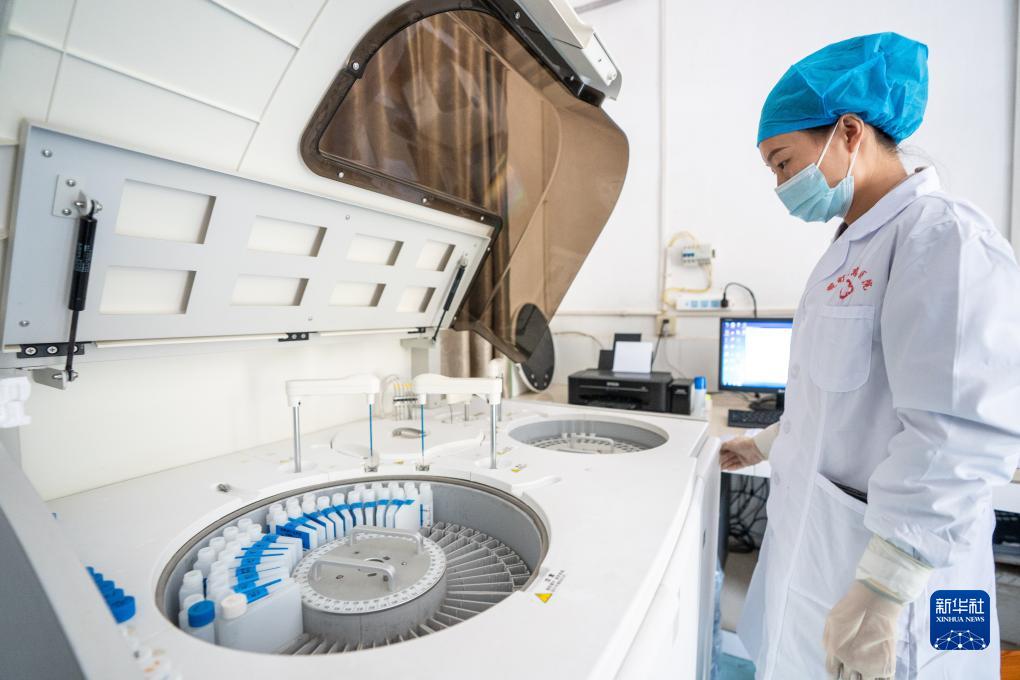 在畹町仁慈醫院,檢驗科的醫護人員在操作化學分析儀(10月29日攝)。