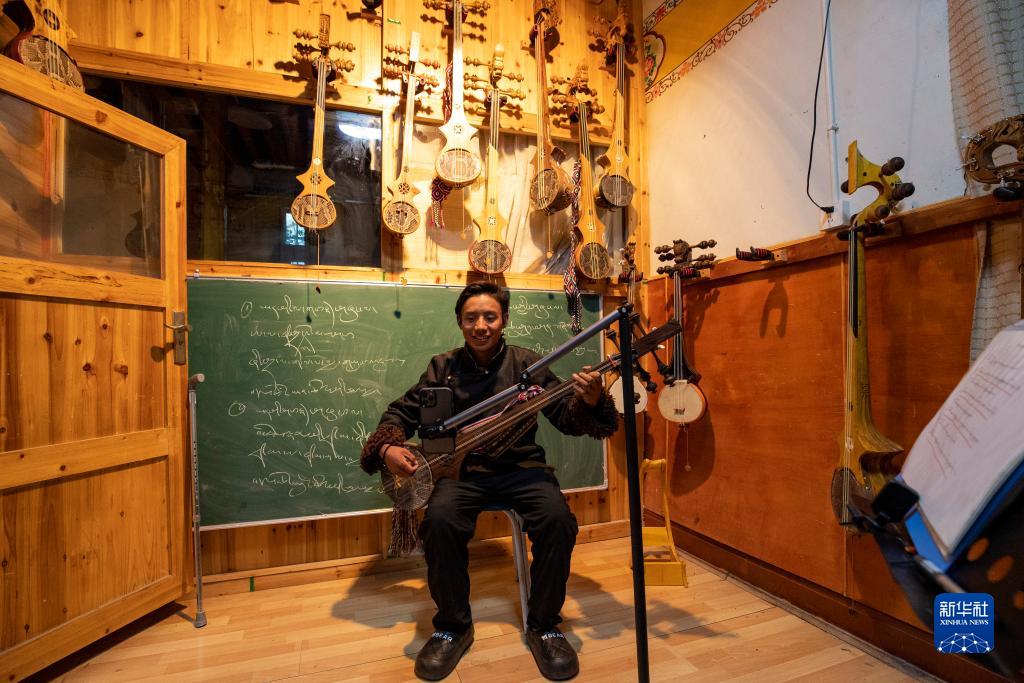 西藏拓崗文化傳播有限公司主播邊桑在直播銷售西藏傳統樂器扎念琴(11月10日攝)。