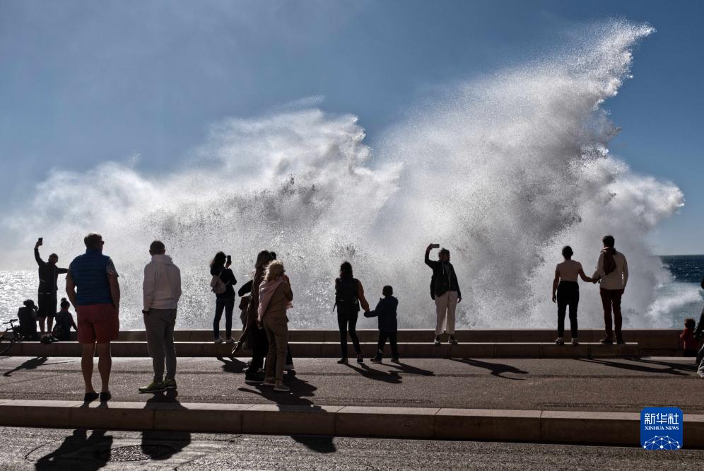 近日,受風(fēng)暴天氣影響,法國尼斯海岸巨浪拍岸,吸引人們駐足觀看。