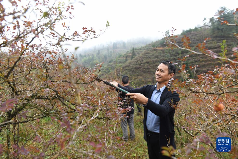 11月8日,貴州龍里縣谷腳鎮茶香村刺梨種植大戶燕啟富給刺梨剪枝。