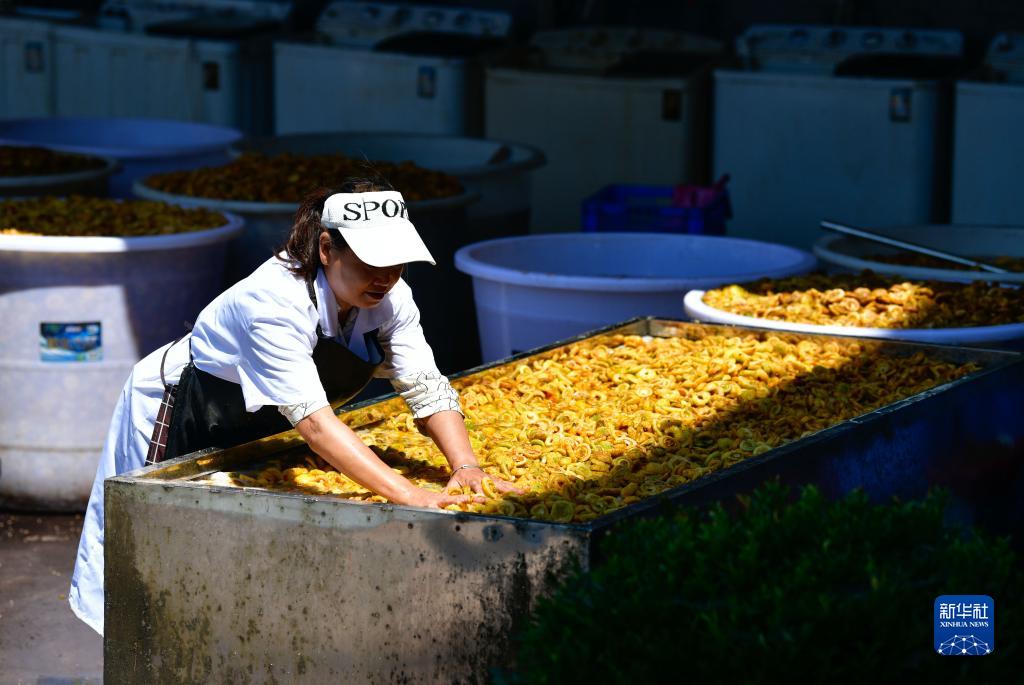農(nóng)民在貴州省龍里縣谷腳鎮(zhèn)高堡村清洗刺梨切片(9月1日攝)。