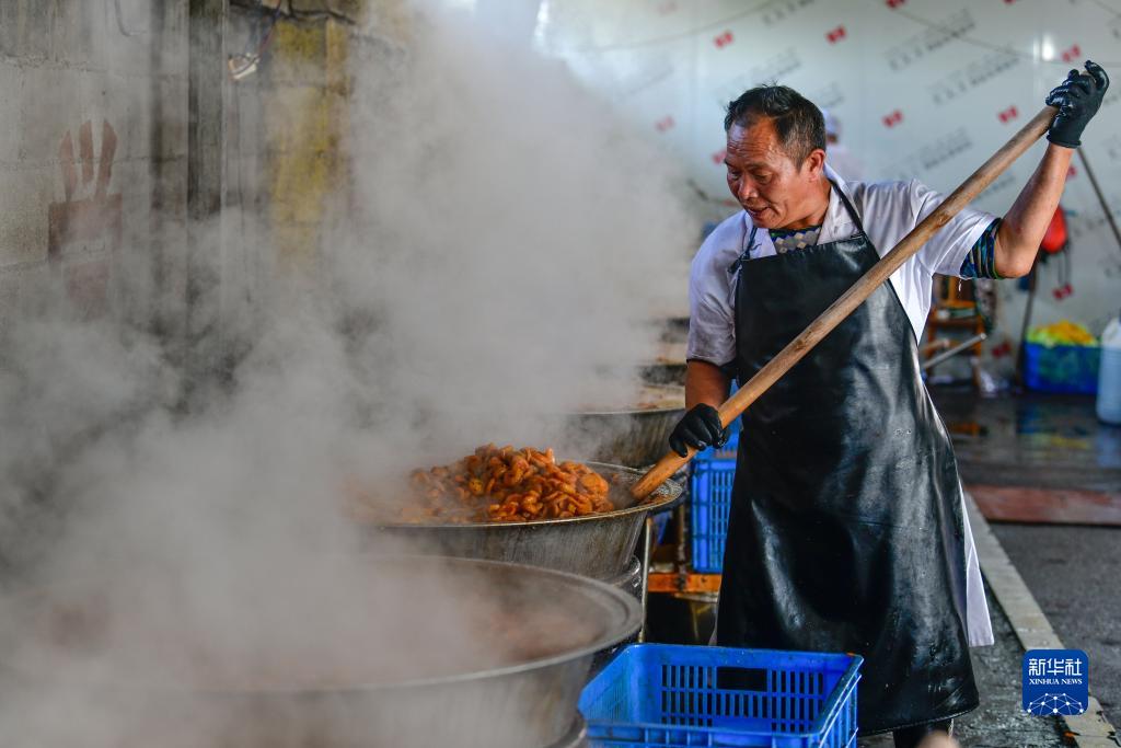農民在貴州省龍里縣谷腳鎮高堡村熬制刺梨果脯(9月1日攝)。