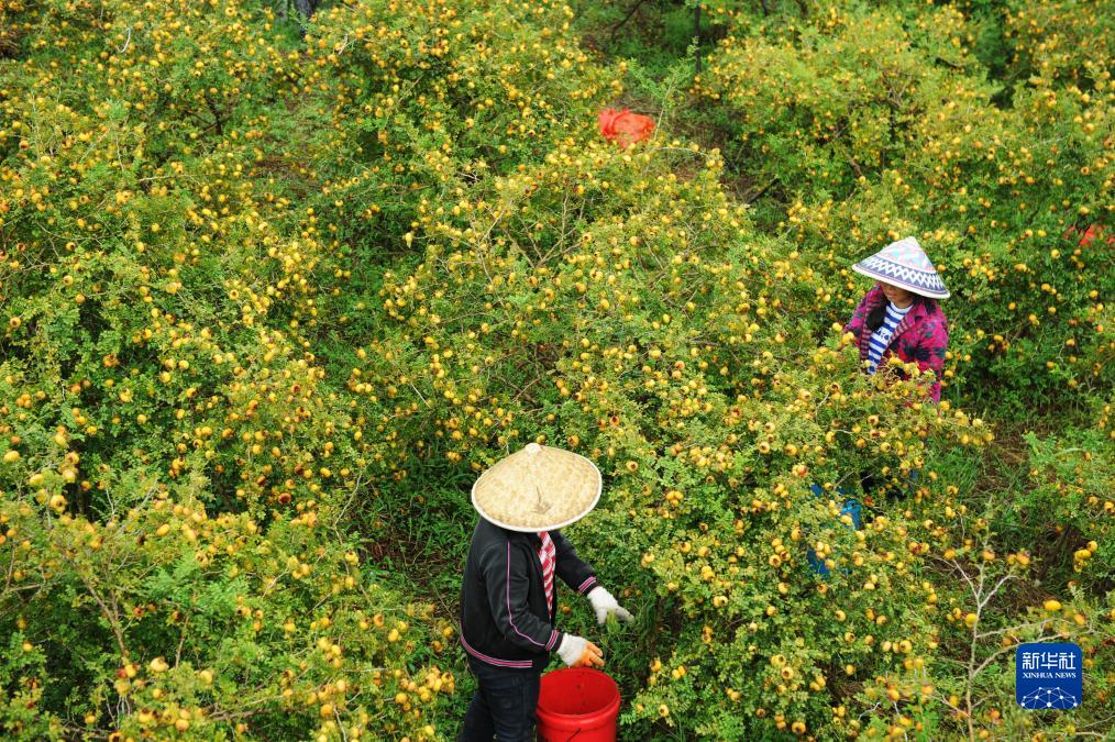 農(nóng)民在貴州省龍里縣谷腳鎮(zhèn)采摘刺梨鮮果(2018年8月22日攝)。
