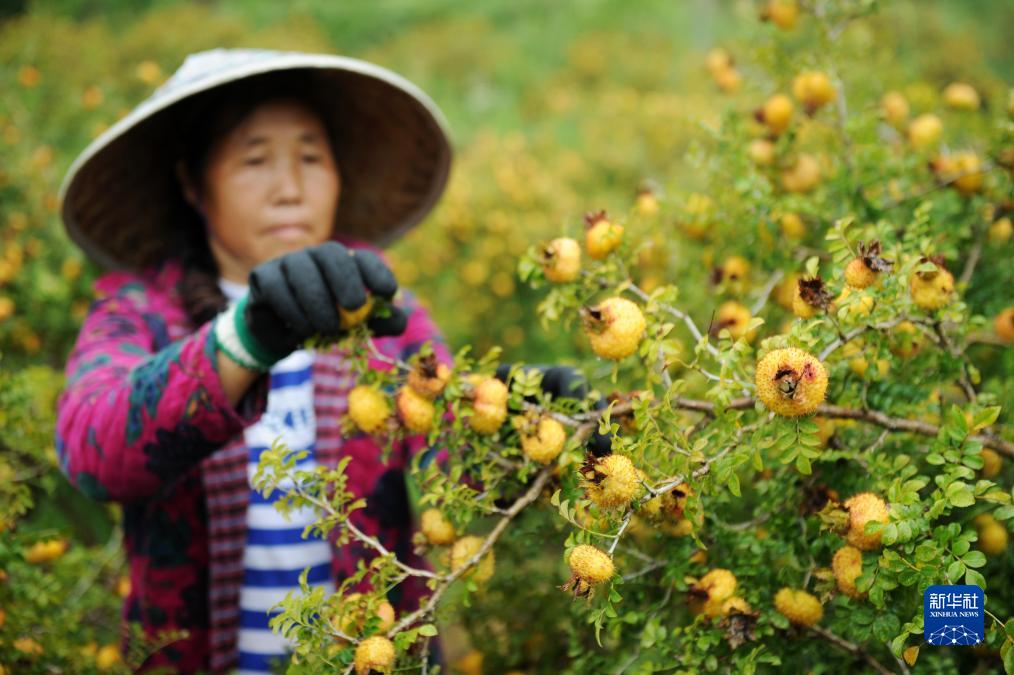 農(nóng)民在貴州省龍里縣谷腳鎮(zhèn)采摘刺梨鮮果(2018年8月22日攝)。