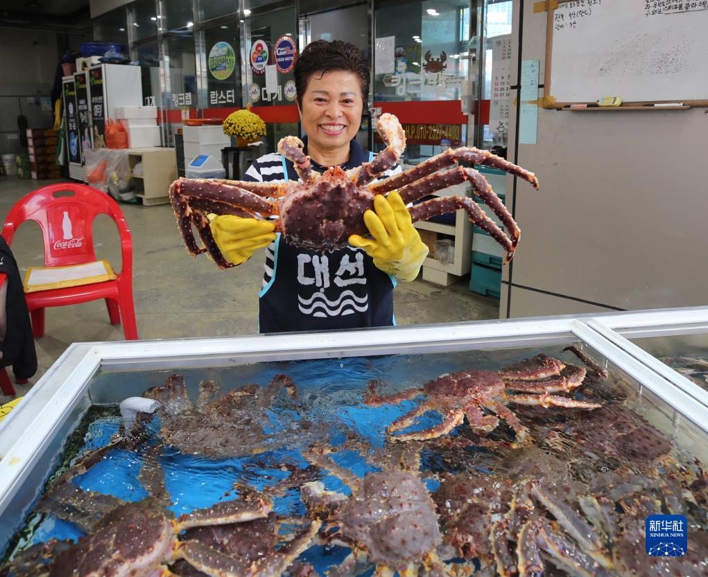 11月10日,在韓國釜山機張郡附近,一名水產(chǎn)商人展示售賣的帝王蟹。